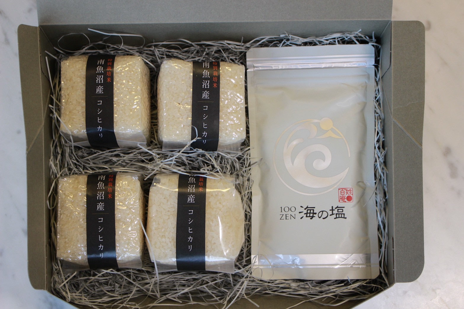 Aセット【内容】お米密封(白米)300g×4個(南魚沼産コシヒカリ)+無添加調味料(だしor塩)